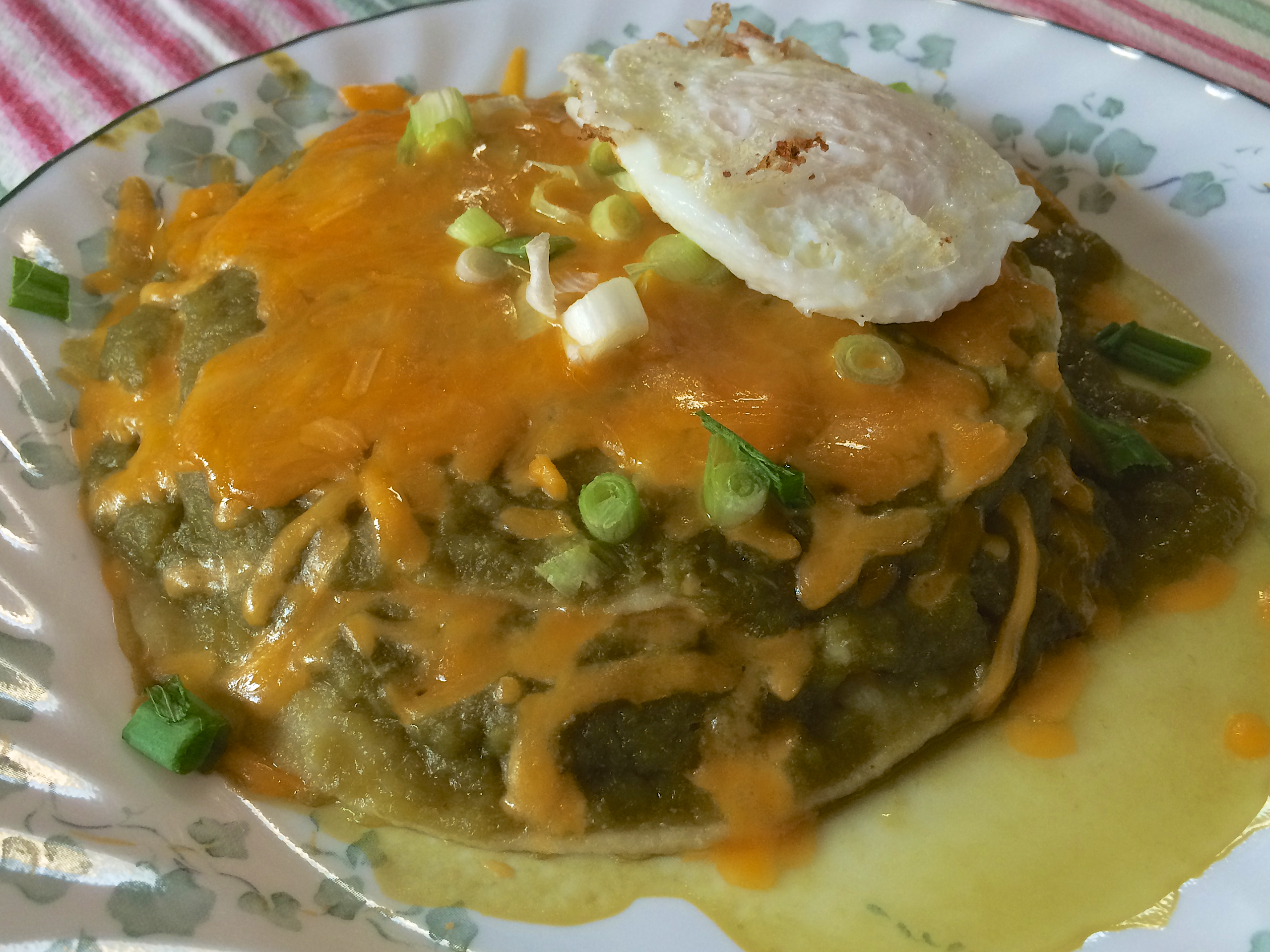here’s a close adaptation, about as good as I can get. I don’t roast the onions. You can adapt/change anything to make it your own. Basic idea is soften corn tortillas, then stack them. You can add whatever you please between them: red sauce, meat, no meat, guacamole, cheese, sour cream, and so forth. Top with a fried egg with a runny yolk so that it breaks and spills into the stack. Hope this helps. Rather easy to be honest, mostly a New Mexico recipe that uses their roasted green Hach chili’s. Obviously, if you aren’t from around there, you can use whatever you have available. Highly adaptable recipe to your liking.