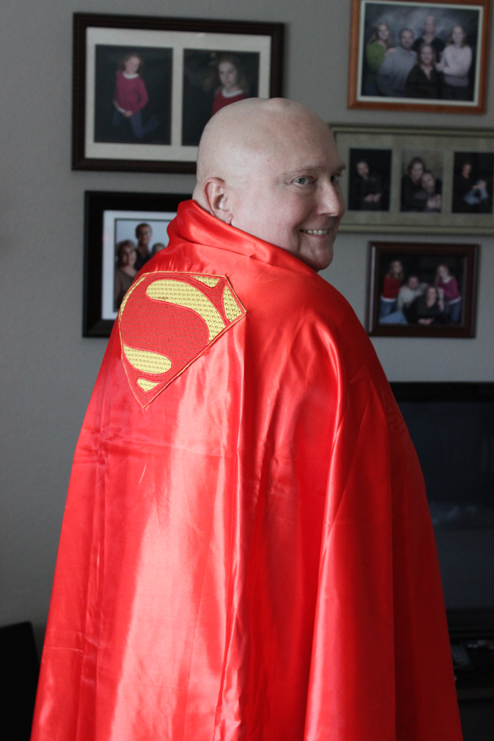 Charlie and Carol came by for a visit today. Charlie has a new camera and pulled a “Robert” on me, that is, he got me in front of the camera (for a change) and I got to be the fool for once. I modeled a couple of hats and decided to try on the **excellent** superman cape sent to me by my sister-in-law Marie and her husband John (thank you!).