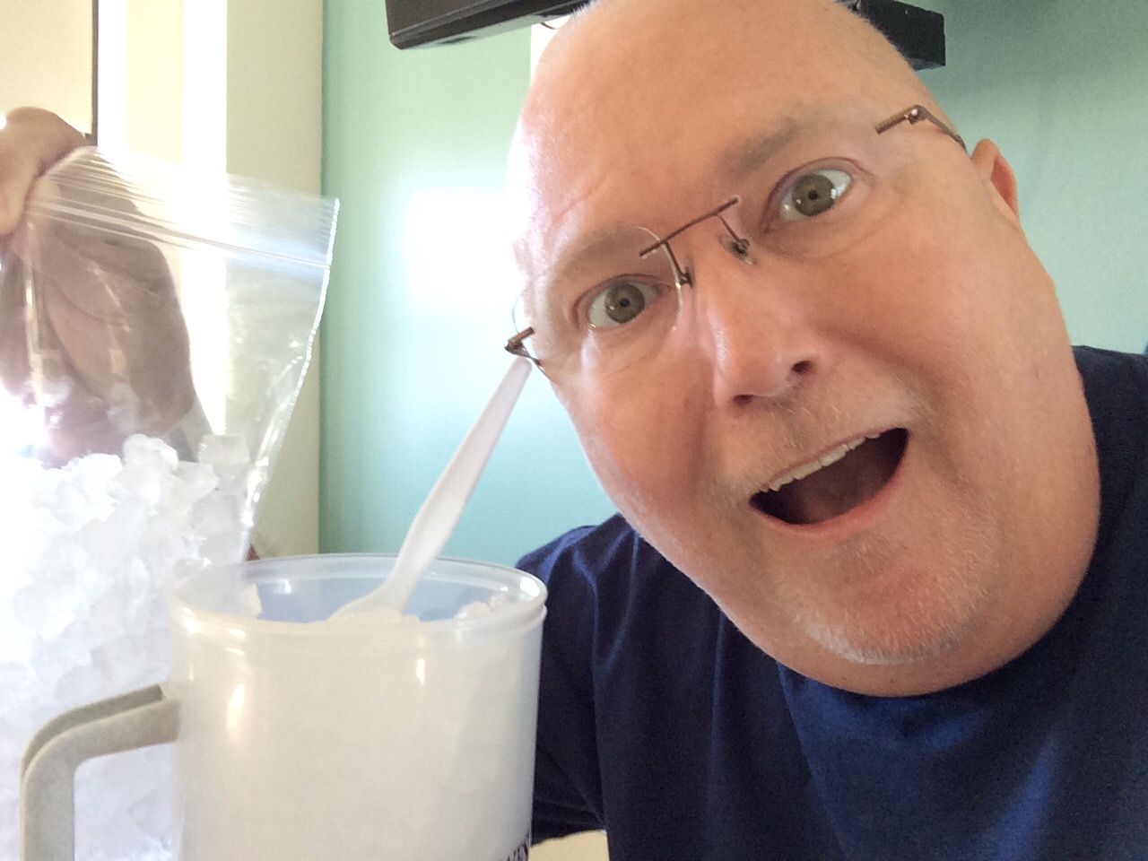 Melphalan usually will cause mouth sores and throat sores and intestinal sores all the way through to the very bottom. Therefore, I am going to be chewing ice and swallowing ice starting 30 minutes before the infusion, all the way through the infusion, and for 30 minutes after the infusion.