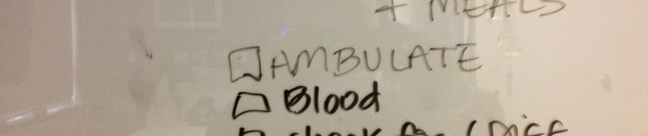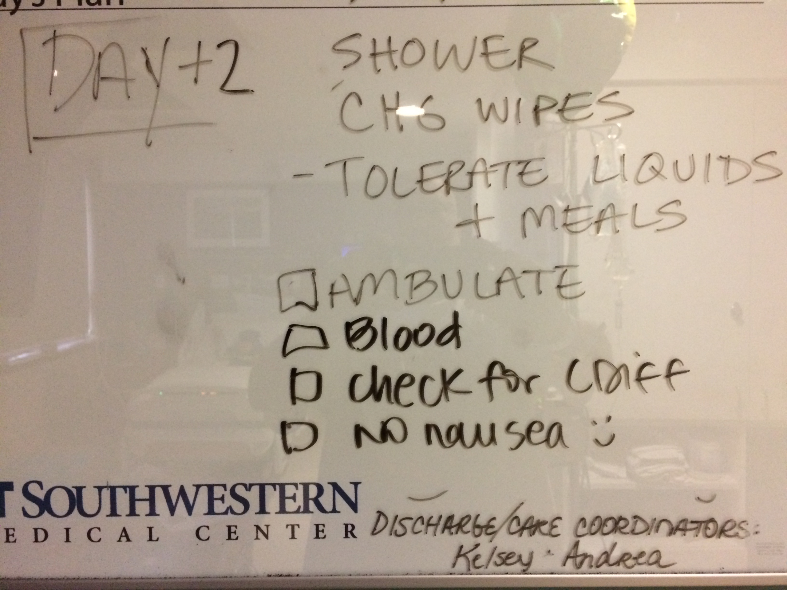 After the transfusion was completed, I felt a good bit stronger. Able to walk a little. I then took a shower. A few hours after that, they performed the odd but necessary ritual of “CHG” wipe down. Everything on my body gets systematically wiped down with the strong antiseptic solution. Avoid face/head/groin/buttocks. Otherwise, every thing gets thoroughly coated.