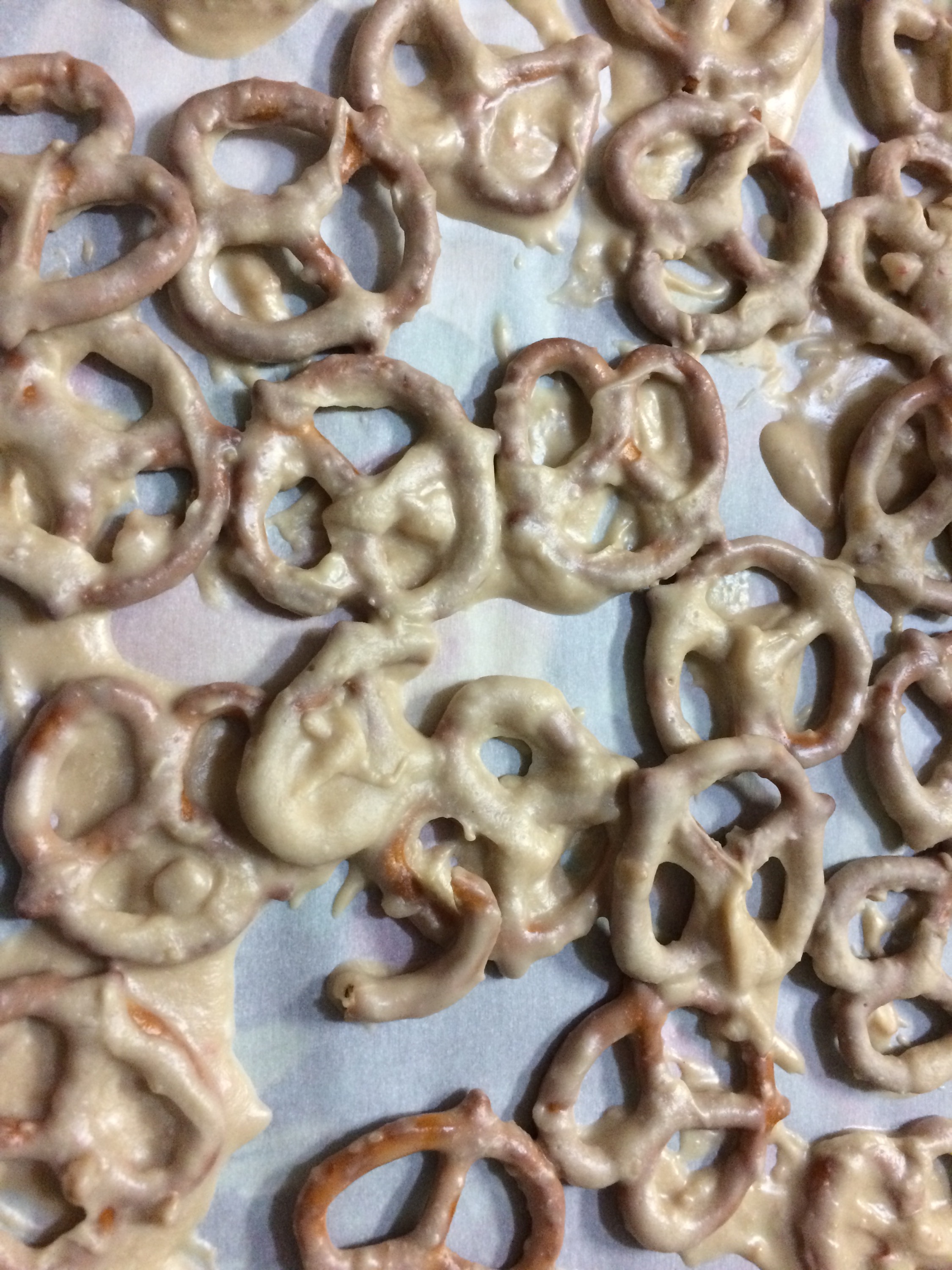 Then I made some melted white chocolate with Mexican vanilla and Heath bits. I dipped pretzels and chex mix into the mixture. Turned out good. Really good. Another home run.