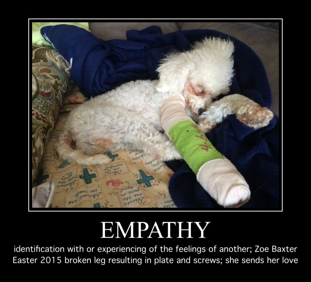 Zoe broke her front leg (common for toy poodles) in 2015, resulting in a surgery, screws, and a plate.